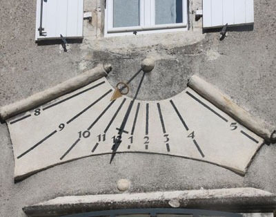 Description | Place de l'Horloge, maison, au-dessus de la porte : cadran peu déclinant du matin, gravé et peint sur ciment, forme de parchemin découpé et roulé, lignes chiffrées, style polaire fléché. |