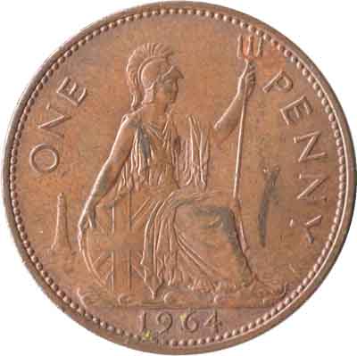 Description | Avers : Effigie droite de la reine Elizabeth II et de l'inscription "+ ELIZABETH II DEI GRATIA·REGINA·F:D:" (Reine par la grâce de Dieu, et le titre de défenseur de la foi). Inscription : +ELIZABETH·II·DEI·GRATIA·REGINA·F:D: Revers : Britannia assise et entourée de la valeur faciale "ONE PENNY" et du millésime. Inscription : ONE PENNY 1964 Tranche : Lisse. |