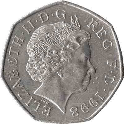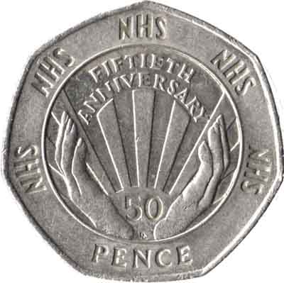 Description | Pièce commémorative : 50e anniversaire du Service National de Santé (NHS). Avers : Effigie droite de la reine Elizabeth II portant le diadème offert en 1893 à la future reine Mary pour son mariage, entourée de l'inscription "ELIZABETH·II·D·G· REG F·D·" et du millésime. Sous l'effigie les initiales "IRB" du graveur Ian Rank-Broadley. Inscription : ELIZABETH·II·D·G REG·F·D·1998 IRB Revers : Dans un cercle au centre deux mains ouvertes font apparaître un rayon de soleil à la base le chiffre "50" et en haut l'i |