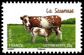 Description | La Saosnoise. Issu du carnet "Les vaches de nos régions". 1 bande de phosphore à droite. Emis en carnet commémoratif. |
