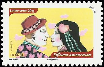 Description | Effluves amoureuses. Emis en carnet "L'odorat". 1 bande de phosphore à droite. Sans valeur indiquée. |