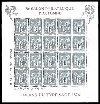 Description | Feuille "70ème Salon Philatélique d'Automne." 140ème anniversaire du type Sage. Le feuillet. |