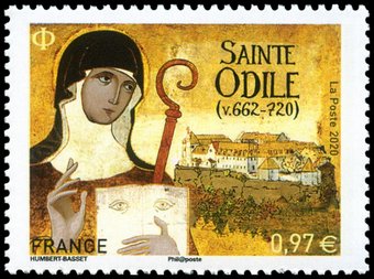 Description | Personnalité. 1300ème anniversaire de la mort de Sainte Odile (v.662-720), fondatrice et abbesse du monastère de Hohenbourg. 1 bande de phosphore à droite. |