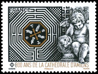 Description | Architecture. 800ème anniversaire de la construction de la cathédrale d'Amiens. Labyrinthe et sculpture de l'ange pleureur. 2 bandes de phosphore. |
