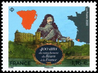 Description | 400ème anniversaire du rattachement du Béarn à la France. Portrait du roi Louis XIII, château de Pau et contours du Béarn. 2 bandes de phosphore. |