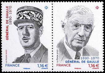 Description | Personnalité. Portraits. 130ème anniversaire de la naissance du Général Charles de Gaulle (1890-1970), militaire français, résistant, homme d'Etat et écrivain. 2 bandes de phosphore. Le dyptique 5444 et 5445. |
