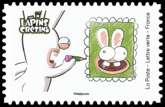 Description | The Lapins crétins. Autoportrait de Lapin crétin. 1 bande de phosphore à droite. Validité permanente. Emis en carnet. |