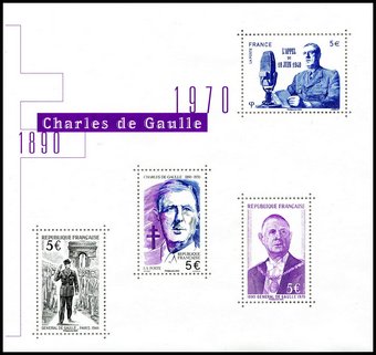 Description | Personnalité. Cinquantenaire de la mort du Général Charles de Gaulle (1890-1970), militaire français, résistant, homme d'Etat et écrivain. 2 bandes de phosphore. Le feuillet. |
