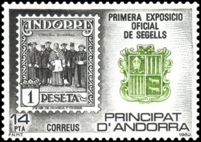 Description | 1ère exposition officielle des timbres-poste andorrans. Timbre sur timbre et armoiries des Vallées. T-P n° 24 d'Andorre espagnol. |