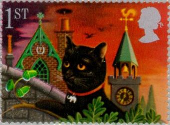 Description | Timbre de voeux. Chat noir et clochers (2 bandes de phosphore). |