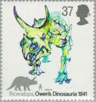 Description | Sesquicentenaire de l'appellation de "dinosaure" donnée aux reptiles de l'ère secondaire par Sir Richard Owen. Triceratops. |