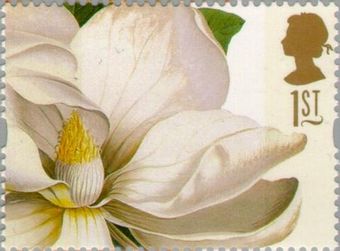 Description | Timbre de voeux, sans valeur indiquée, dessin de fleur. 2 bandes de phosphore bleuté au fluor. Magnolia altissima. |