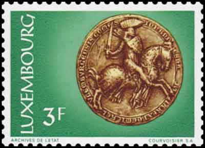 Description | Sceaux des 13e et 14e siècles.Sceau équestre, 1337 : Jean, Comte de Luxembourg, Roi de Bohême. |