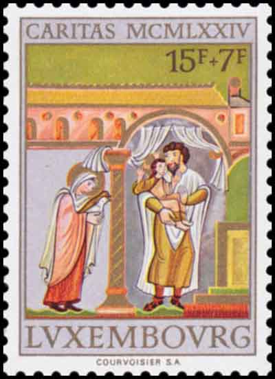 Description | Cinquantenaire de l'émission de bienfaisance"Caritas".Enluminures."Présentation au temple". |