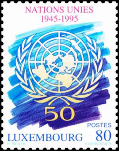 Description | 50e anniversaire de la fondation de l'Organisation des Nations Unies (O.N.U.).Emblème et nombre 50. |