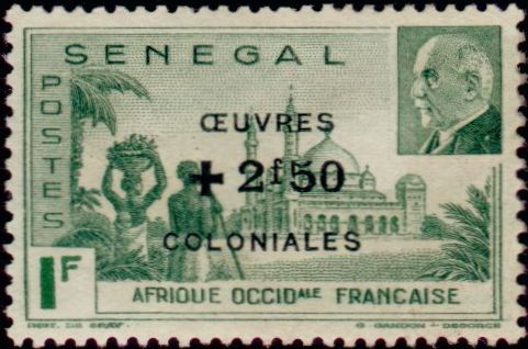 Description | Mosquée de Djourbel et effigie du Maréchal Pétain, surchargé OEUVRES COLONIALES. |